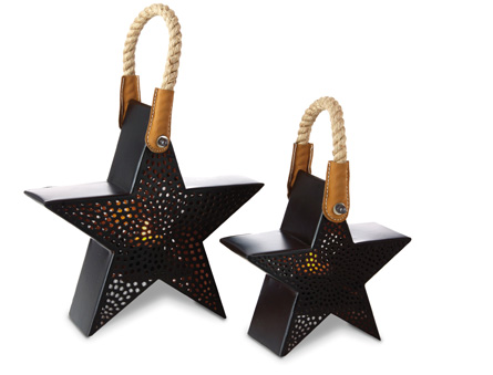 Enjoy the flicker of candlelight as snow falls outside. These rustic bronze star-shaped tea light holders feature pierced metal and a rope handle for display in various environments.